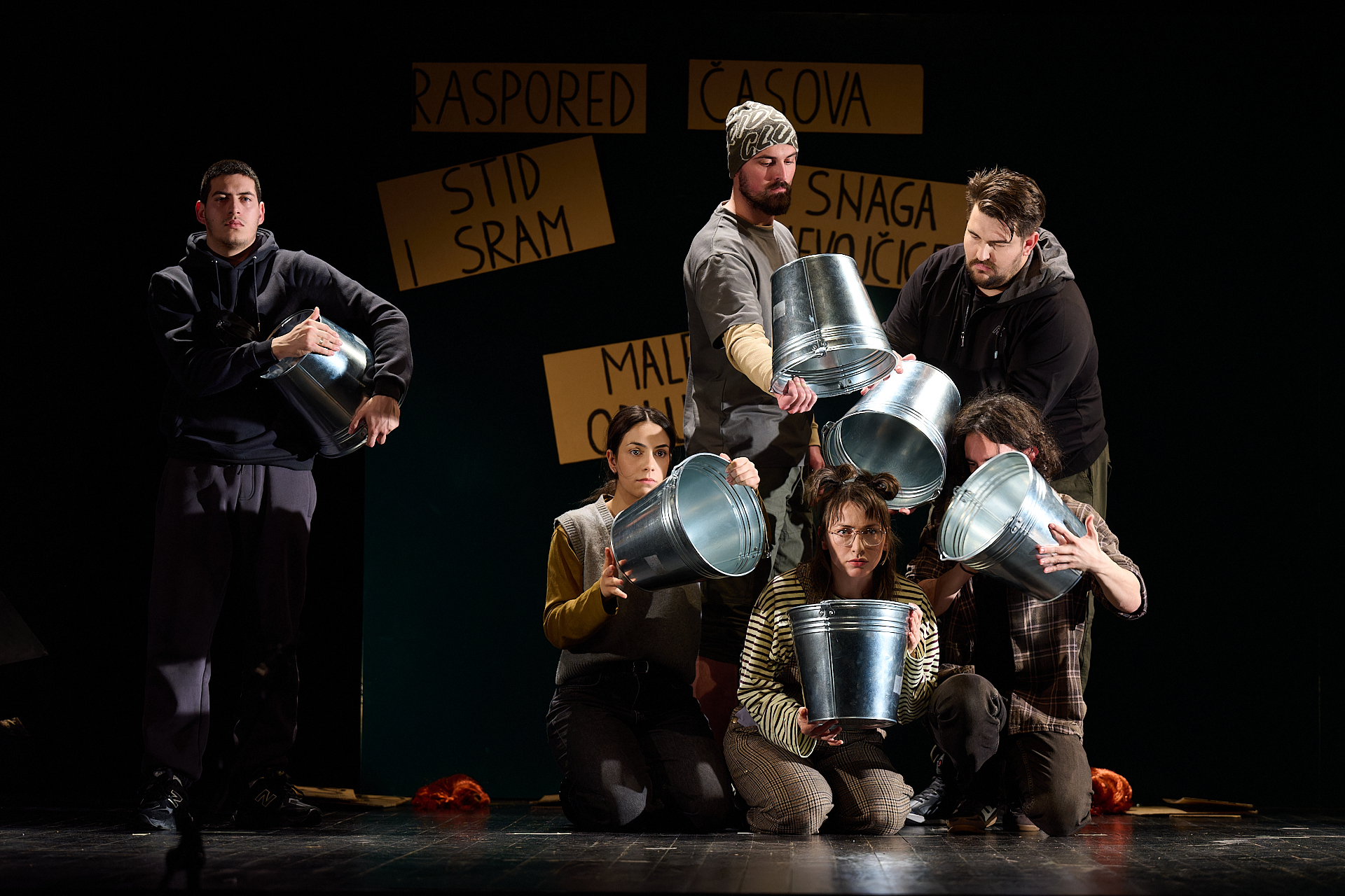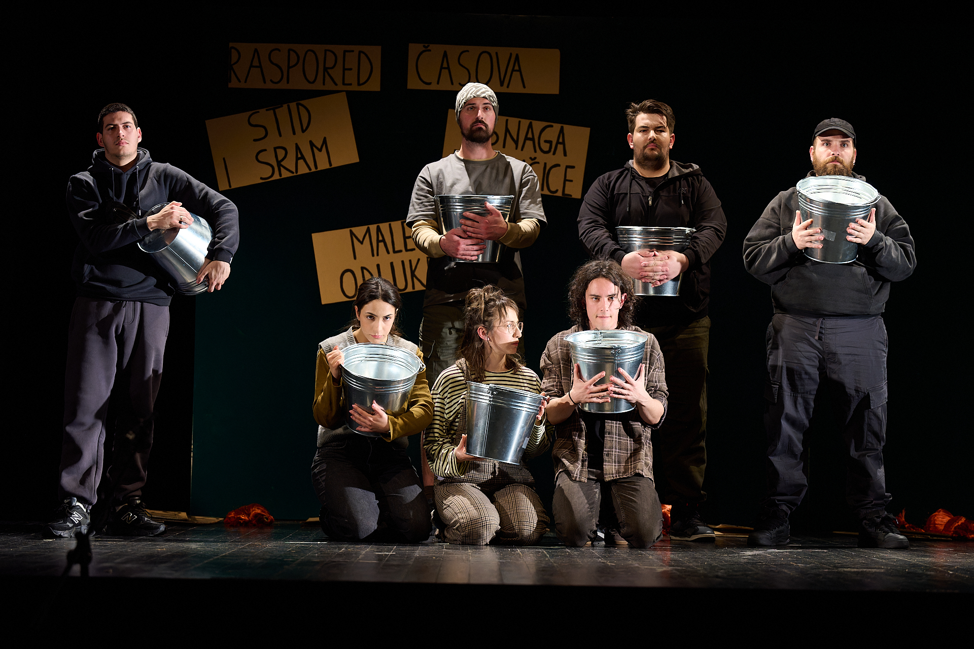 U predstavi igraju: Anđelija Rondović, Omar Bajramspahić, Maša Božović, Nemanja Todorović, Kristijan Blečić, Miloš Kašćelan i Aleksa Balević